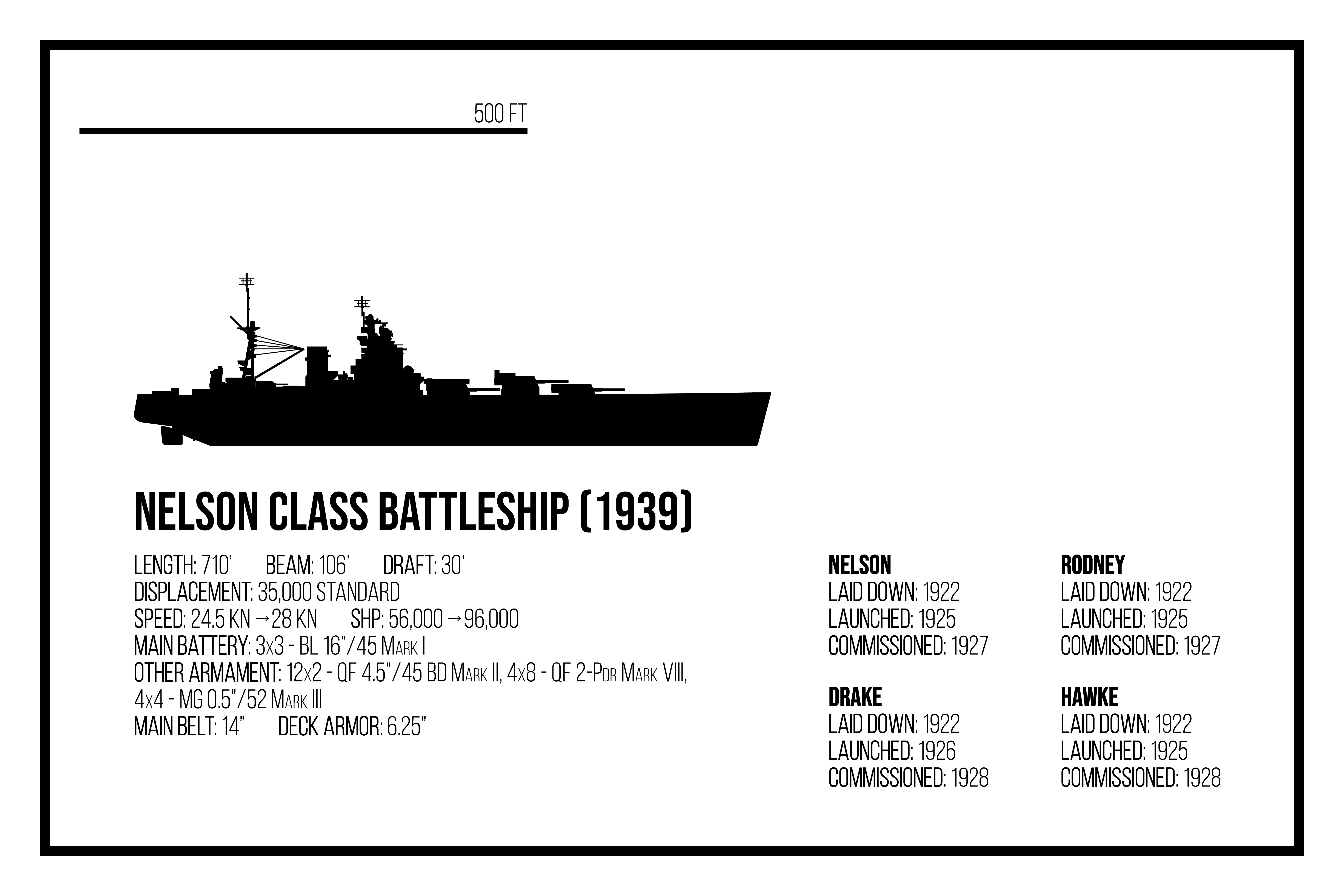 For their four new battleships—Nelson, Rodney, Drake, and Hawke—the Admiralty selects a modified O3 design armed with nine 16-inch guns and displacing exactly 35,000 tons standard.1 The main departure from the O3 design is reworking the six-inch magazines to allow for increased machinery spaces and a design speed of 24.5 knots (functionally closer to 26). The Admiralty had preferred the F3 design, with a speed of 28 knots and armed with triple 15”/50 guns, but felt compelled to build ships armed with 16-inch guns for the sake of prestige—and to maximize their potential fighting power under the new limitations.