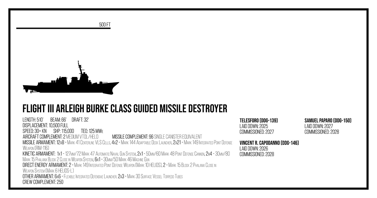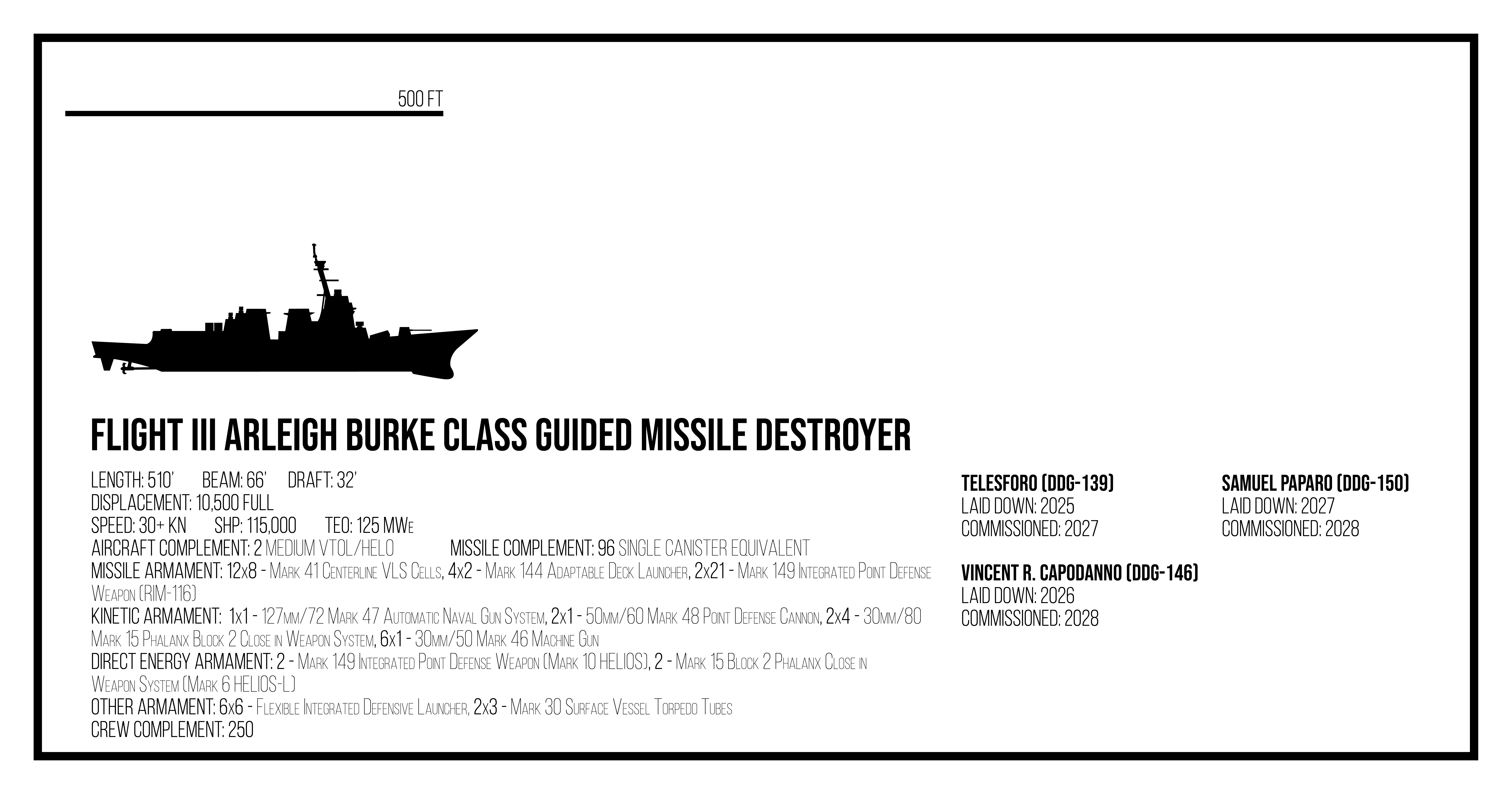 Direct Energy Armament: 4 - 500 kW Mark 13 Direct Energy Weapon Mount, 2 - 50 kW Mark 15 Block 2 Close-in-Weapon System (Mark 6 HELIOS-L)